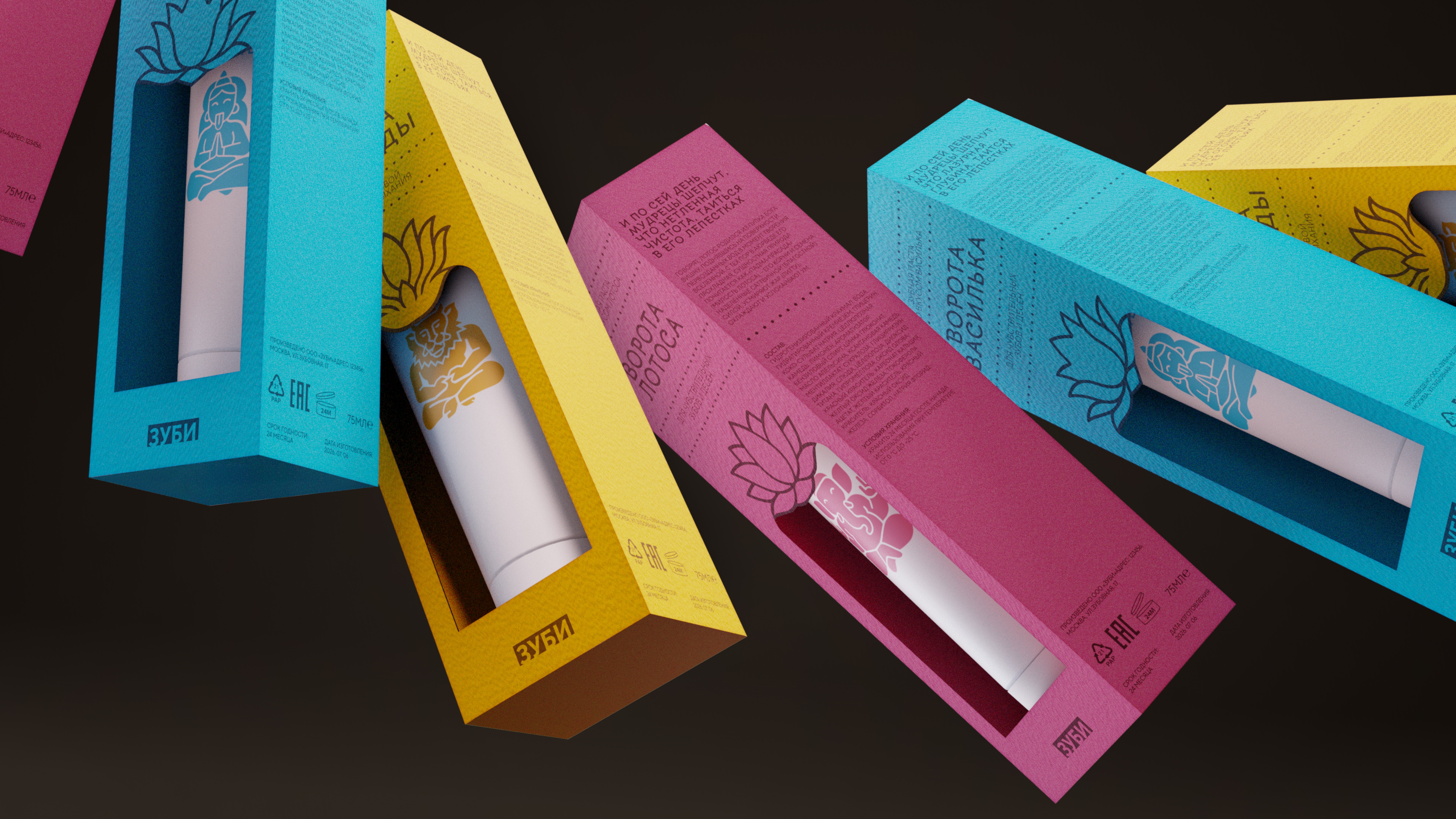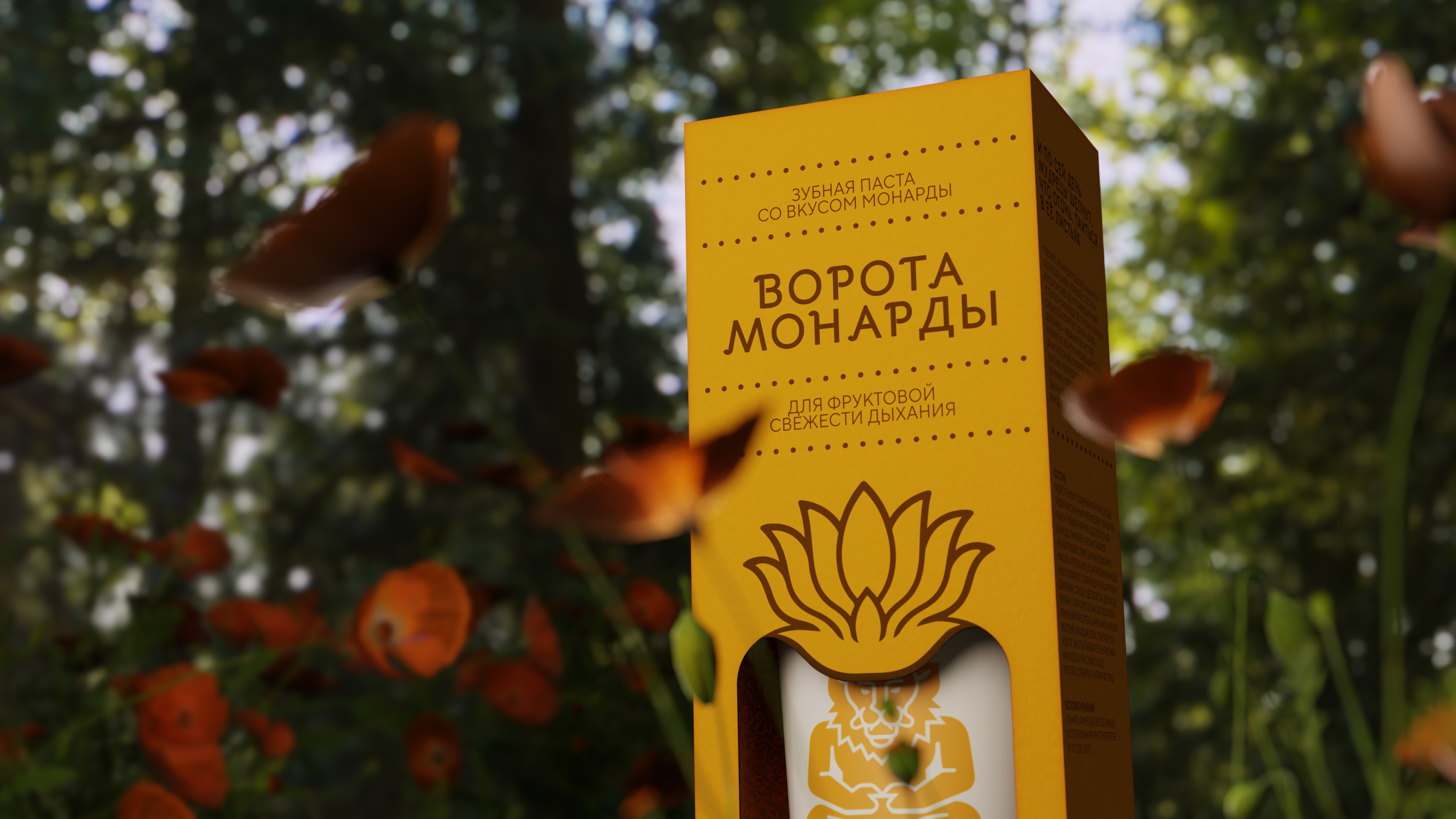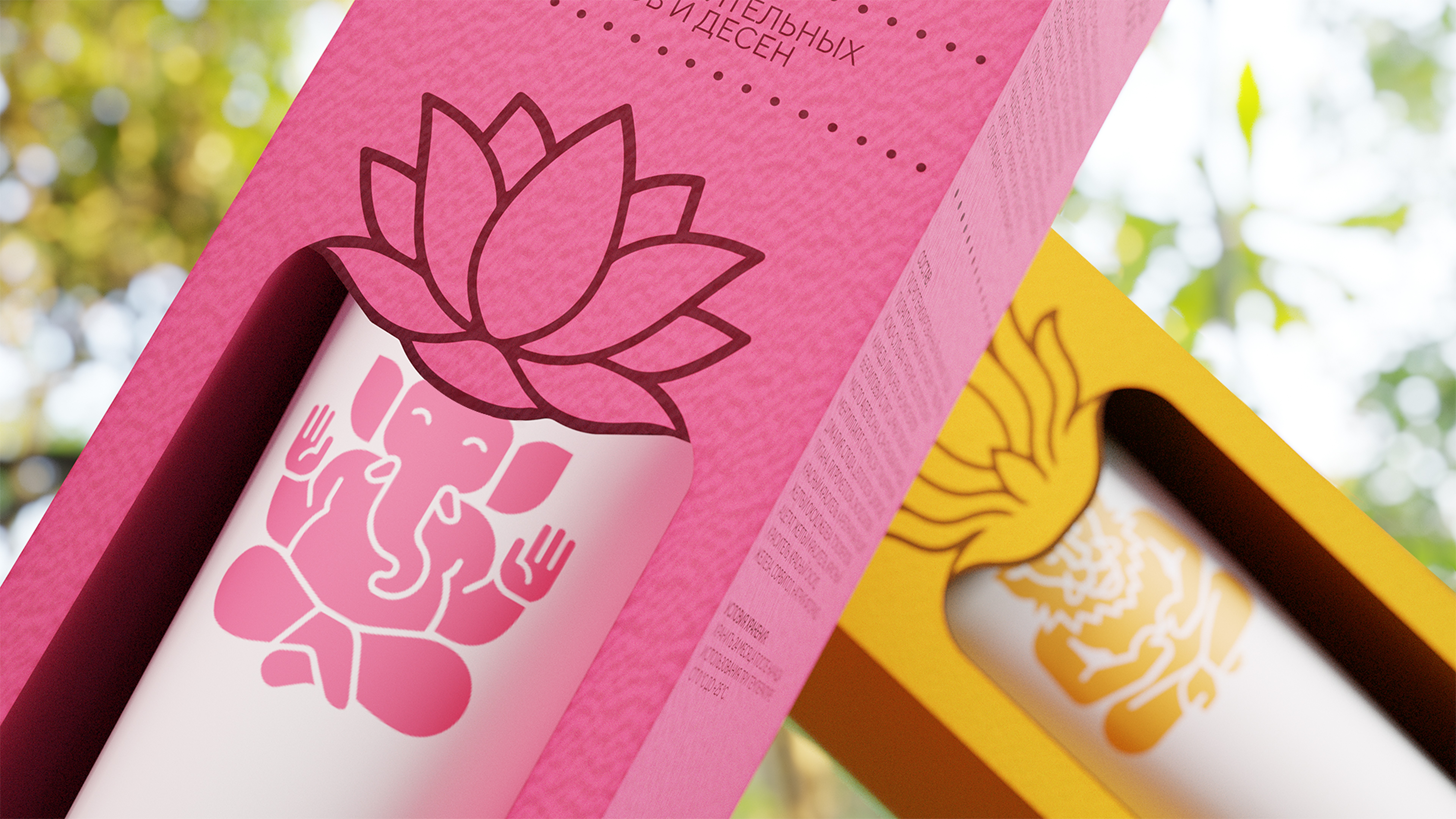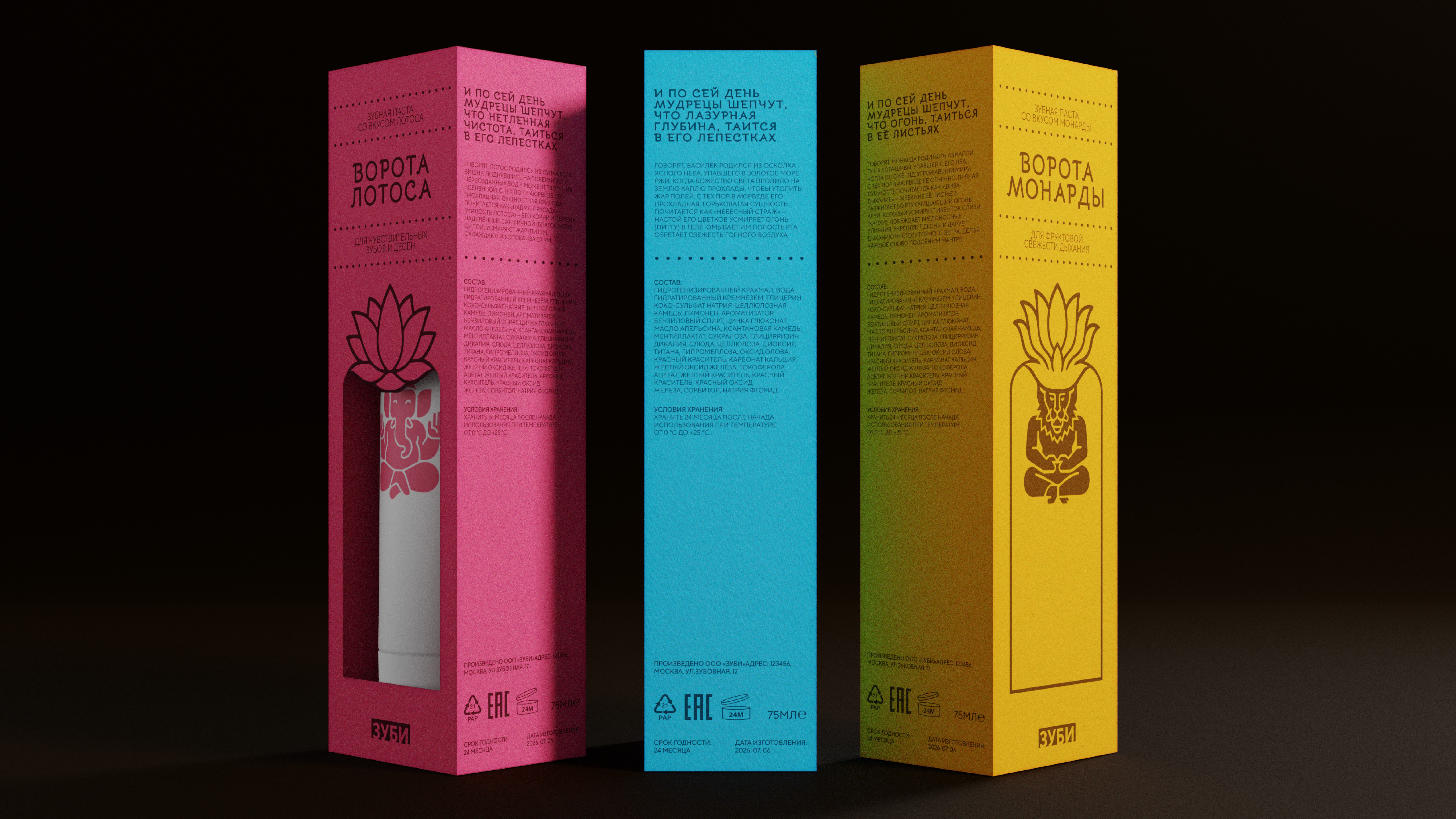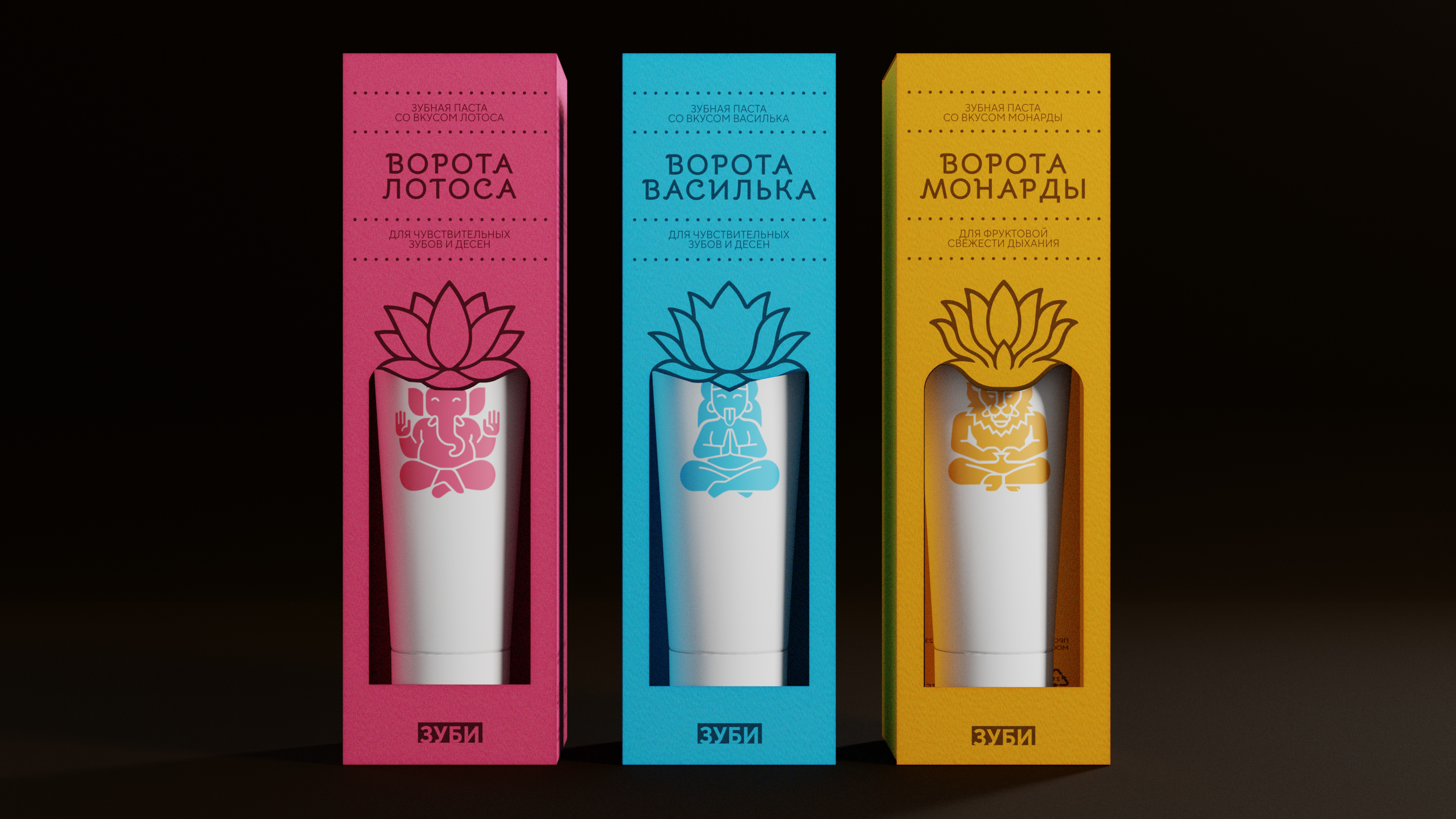 Упаковка линейки зубных паст вдохновлена арками в буддийских храмах, сама коробка выполнена с вырубкой, символизируя вход в храм гигиены и чистоты